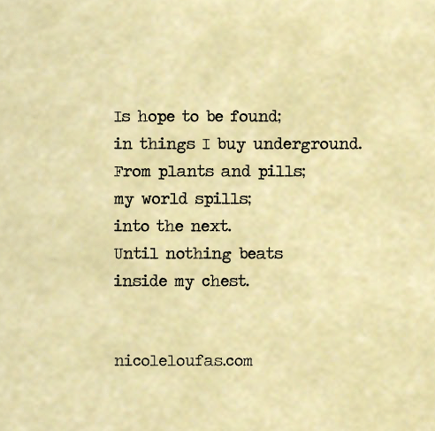Is hope to be found; in things I buy underground. From plants and pills; my world spills; into the next. Until nothing beats inside my chest.